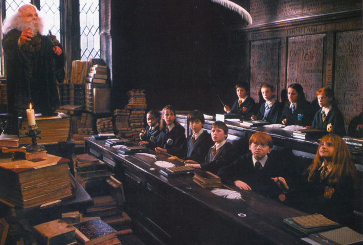 Here's a picture from Charms Class with Professor Flitwick, played by Warwick Davis (Willow). If you think it's odd that he's so small, it does say in the books that Flitwick was so tiny he had to stand on a pile of books just to teach his classes. This is also from the same scene that is in the trailer, where Hermione is doing a spell and looking back at Ron. Who are all these other people? I believe the one on the far left may be Dean Thomas, but besides that I don't know. I'll have to check back in the books and see who Gryffindor had Charms with.