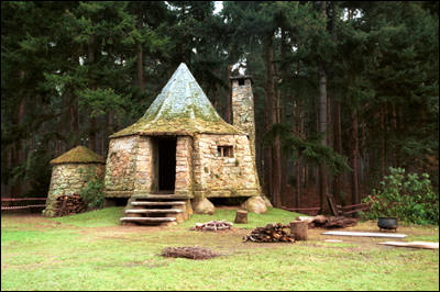 This is an awesome picture of Hagrid's Hut for the HP movie. It's somewhat unlcear of the location of the hut, but I think almost for sure that this is actually outside and not in a studio. Note the Forbidden Forest behind, which really seems to be just as J.K. describes it.