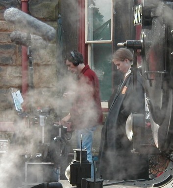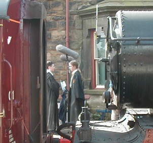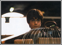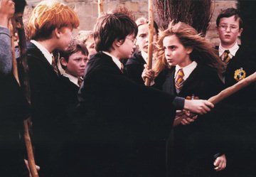 A very cool picture outisde. Hermione look great, although Harry's hair still looks weird. This is probably the scene where Harry is getting on the broom to challenge Malfoy. See anyone in the pic that looks like Malfoy? The boy in between Harry and Ron to the left looks too small. Do you think you recognize anyone else? Post any ideas on the Movie Board.
