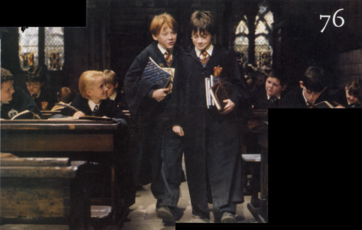 This is a great picture of Harry, Ron, and the rest of a large class. That must be Malfoy to their left, and could that be Neville in the background on the right? I wonder who's class this is. It couldn't be Snape's since there are windows, and his class is in the dungeon. Wherever it is, it seems to be from the same scene of a previous publicity still with Harry and Ron (further down this page), where they appear to be frightened for some reason.