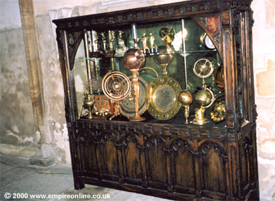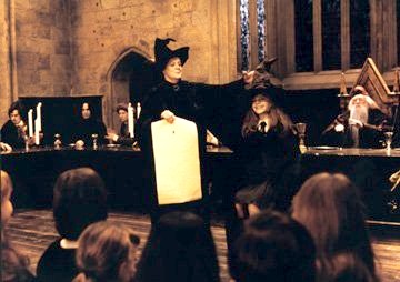 This is Hermione being sorted, grinning broadly. Lets direct our attention to the teachers. The only one I can't even make a guess at is the one on the far left. Please let me know your ideas about this on the board. Next to him, I am definently hoping that that is Snape. If so, he looks really cool. The pale drawn face......Alan Rickman seems to have worked out well. Then there's the man that's slightly obscured, but I'm guessing that that is Quirrell, given that I think I can make out a turban on his head. Another great look. Of course, next to him is Albus Dumbledore, who looks really awesome, almsost perfect. If this is any indication of how the teacher casting went, I'm very impressed. Sorting Hermione would be McGonagall, who is played by Maggie Smith. I can't make out for sure what color her hair is, but I hope they dyed it to make her look younger. Moving on.......